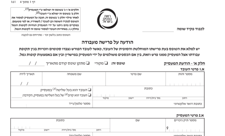 טופס 161 החדש, הודעה על פרישה מעבודה, הוא הטופס אותו מגישים לעובד בסיום עבודה. המדריך המלא, כיצד יש למלא את טופס 161 החדש בהתאם לתקנות האחרונות של רשות המיסים.