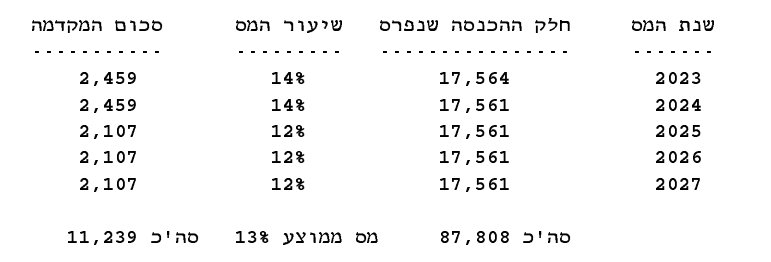 פריסה קדימה מאפשרת לייחס את ההכנסה מכספי הפיצויים לשנים הבאות, מכיוון שהכנסתו של אברהם צפויה לרדת בשנים הבאות ביחס להכנסה שלו בתקופת העבודה בחרנו להתחיל את הפריסה בשנת 2023 ולא בשנת 2022.