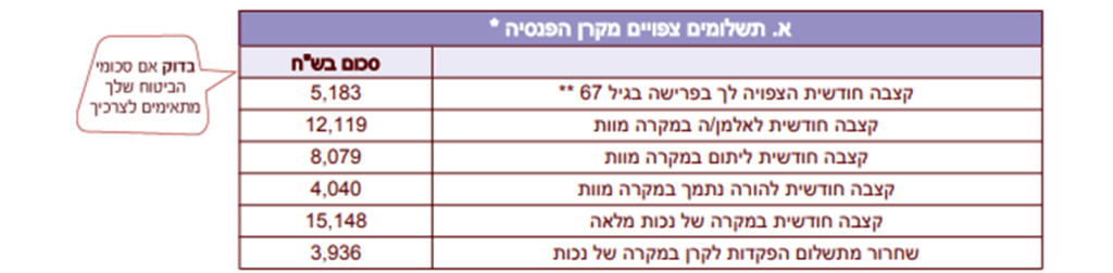 לצורך הדוגמה בדוח השנתי הזה מקרן הפנסיה הקצבה הצפויה היא 5,183 ש"ח בחודש. הקצבה הנל מחושבת לגיל 67 בהנחה שהפורש יקבל קצבה לכל החיים ובת זוגו תקבל אחריו קצבה בשיעור של 60%.