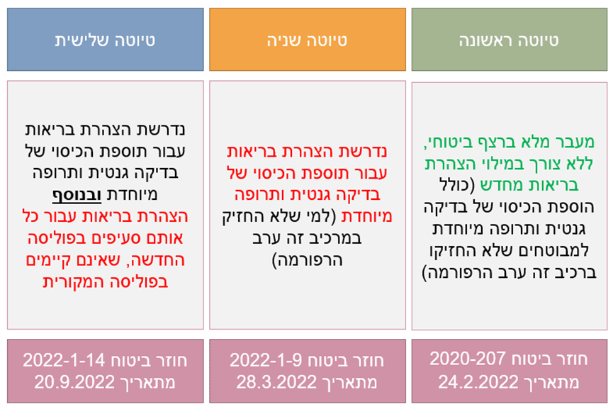 3. מי שיש לו מוצרים שנרכשו בין 2.2016 עד 5.2023 ורוצה לעבור לרפורמה, יוכל לעשות זאת בכפוף לחתימה על הצהרת בריאות. הצהרת הבריאות שתיחתם לא תחול על כל סעיפי הפוליסה אך כן תחול במקרים בהם הפוליסה החדשה כוללת כיסוי שלא הופיע בפוליסה הקיימת למבוטח.