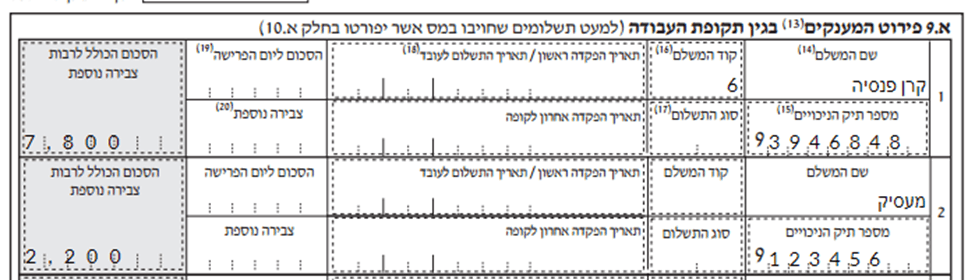 לפניכם דוגמה של עובד שנצברו לרשותו כספים בקרן הפנסיה והוא מקבל השלמת פיצויים מהמעסיק. עליכם להעתיק את כספי הפיצויים שנרשמו על ידי המעסיק בחלק א. 9 אל הטבלה שמופיעה בחלק ב' כפי שמופיע בדוגמה.