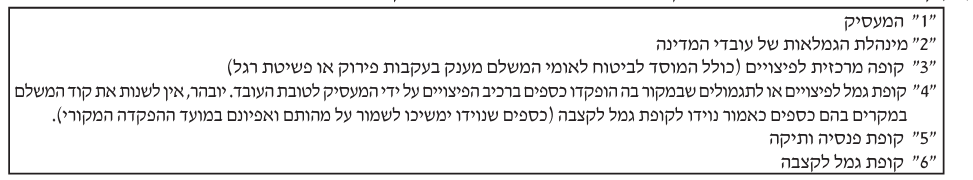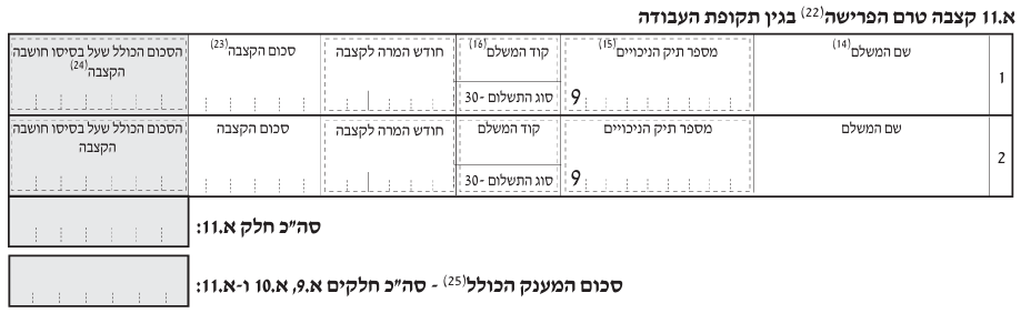 - כל כספי הפיצויים שעומדים לרשות העובד בסעיף א.9 הופקדו בקופה לקצבה כלומר אין כספים בקוד 4 או השלמת כספים על ידי קופה מרכזית או על ידי המעסיק.