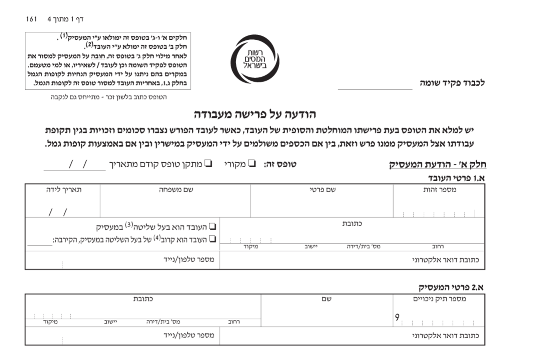 טופס 161 החדש, הודעה על פרישה מעבודה, הוא הטופס אותו מגישים לעובד בסיום עבודה. המדריך המלא, כיצד יש למלא את טופס 161 החדש בהתאם לתקנות האחרונות של רשות המיסים.