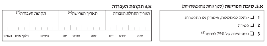 - סעיף א.3, סיבת הפרישה– במרבית המקרים נסמן את סעיף 1, יציאה לגמלאות, פיטורין או התפטרות. במקרה של מוות, נסמן את סעיף 2. במקרה של מוות זכאים השארים לפטור מוגדל על כספי הפיצויים (תקרה כפולה) בשנת 2024 התקרה הכפולה עומדת על 27,520 ש"ח עבור כל שנת עבודה.