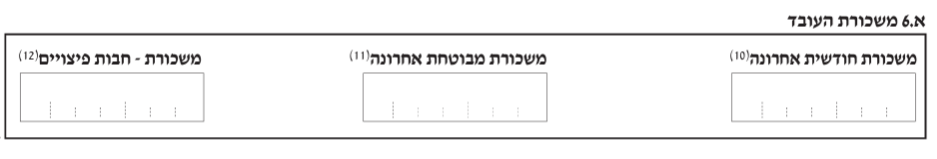 - סעיף א.6, משכורת העובד– משכורת חודשית אחרונה, הכנסת העובד מעבודה למעט תשלומים ששולמו לו לכיסוי הוצאות ולמעט שווי רכב. המשכורת החודשית תשמש אותנו מאוחר יותר לצורך קביעת תקרת הפיצויים. סעיף המשכורת החודשית עשוי להיות גבוה מסעיף שכר העבודה שמופיע בצד שמאל.