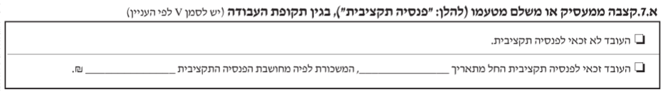 - קבלת פנסיה תקציבית – הטופס בוחן את זכאות העובד לפנסיה תקציבית והאם בגין אותו שכר הופקדו עבורו כספים נוספים לחיסכון הפנסיוני