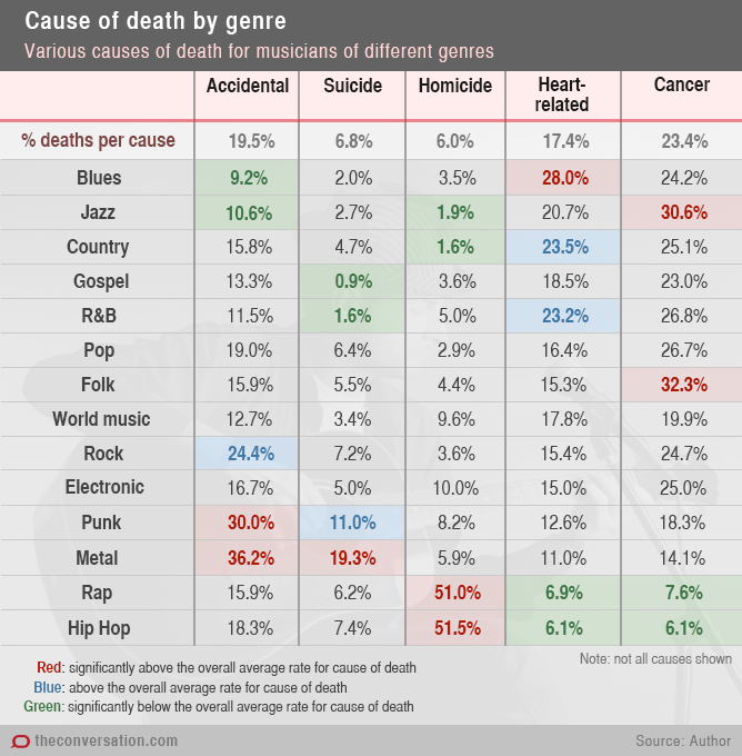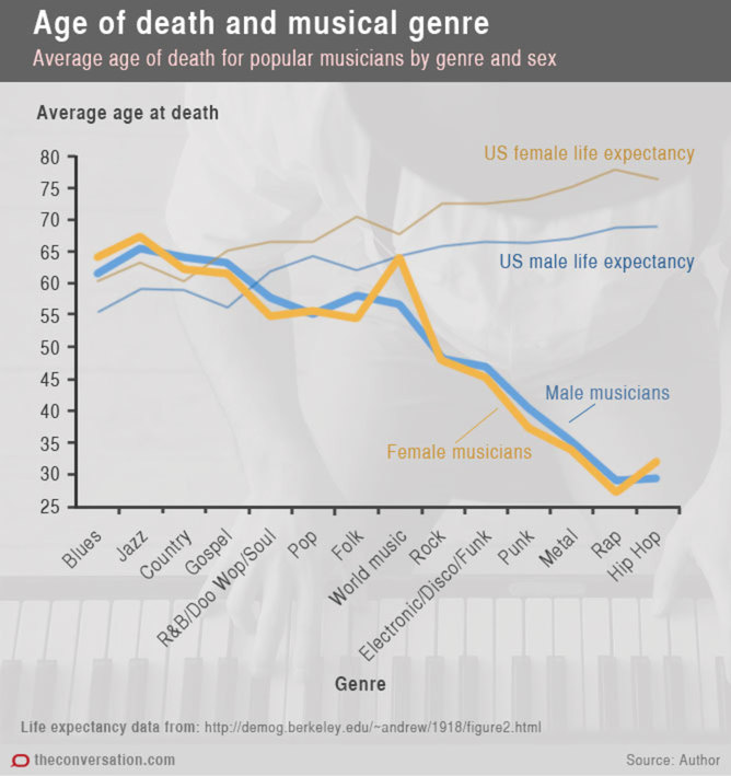 הגרף בתמונה מראה סגנונות מוזיקלים שונים, מישנים כמו בלוז וג'אז ועד סגנונות חדשים כמו מטאל, ראפ והיפ הופ ואת גיל המוות הממוצע של מוזיקאים פופולריים מאותו הז'אנר מול תוחלת החיים בארצות הברית לגברים ונשים שנולדו באותה השנה.