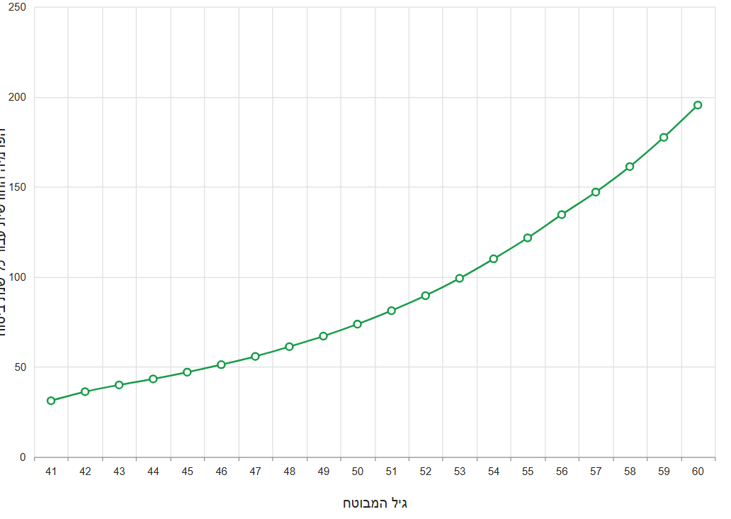 גם בגיל מבוגר, עלות הביטוח השנתית זולה יותר מאשר העברת הכספים לקופת גמל. לדוגמה בגיל 55, ביטוח החיים יעלה לנו 120 ש"ח בחודש ובשנה 1,450 ש"ח.