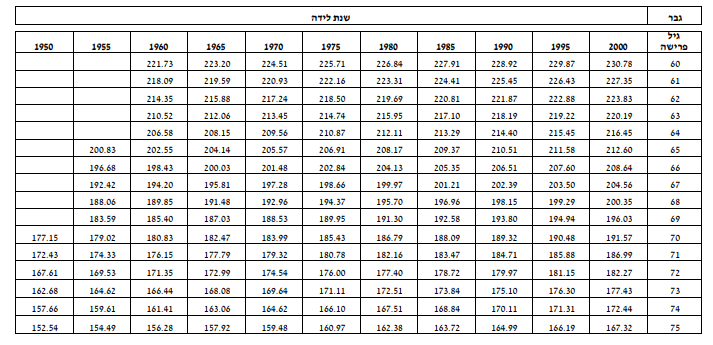 שמתסכלים על המקדם לגיל 67 עבור פורש שנולד בשנת 1955 רואים כי המקדם עומד על 192.42. לעומת זאת, המקדם של פורש שנולד 40 שנים מאוחר יותר יעמוד על 203.50.