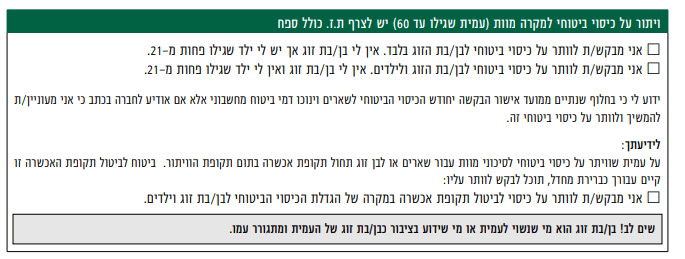 לעניין הזכרון – לצערי נתקלתי במספר מקרים בהם אנשים שבמהלך פגישה ויתרו על כיסוי לשארים ולאחר מכן שכחו להחזיר אותו. למרבה הצער הם נפטרו לפני שחלפו השנתיים והכיסוי חזר באופן אוטומטי.