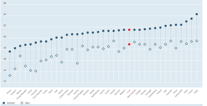 לפי נתוני ה OECD אישה בת 65 בישראל צפויה לחיות עוד 21.5 שנים ואילו גבר בן 65 צפוי לחיות עוד 18.9 שנים. נתונים אלו גבוהים כמובן מתוחלת החיים בלידה (רוצים לדעת למה?).
