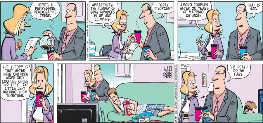 בשנים האחרונות עולה שיעור הגירושין בקרב זוגות בגיל השלישי (Gray Divorce). מאז שנות ה – 90 שיעור הגירושין בקרב זוגות מעל גיל 50 בארצות הברית הכפיל את עצמו, מאז שנות ה- 60 מדובר בעליה של 700%. ביפן שיעור הגירושין לאחר 30 שנות נישואים הכפיל את עצמו פי 4 וזכה לכינוי מיוחד – retired husband syndrome.