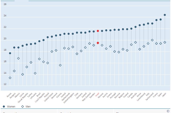 | תוחלת חיים בפרישה | 84.5 | 86.6 |