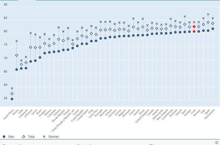לפי נתוני ה OECD, תוחלת החיים בלידה לתינוק (זכר) שנולד בשנת 2016 היא 80.7 שנים ותוחלת החיים בלידה לתינוקת היא 84.2 שנים.