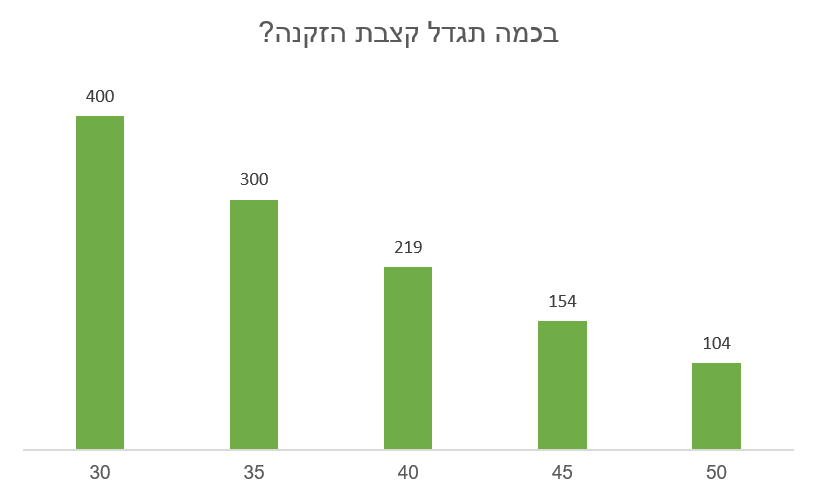 לדוגמה, הפקדה מגיל 30 של 100 ש"ח בחודש תגדיל את קצבת הזקנה שלך ב- 400 ש"ח נוספים מידי חודש.