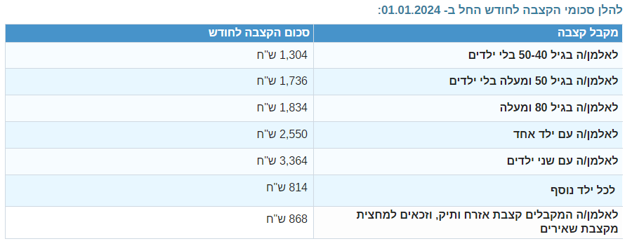 במידה ונקבע שיעור אי כושר העולה על 74% סכום הקצבאות יהיה: