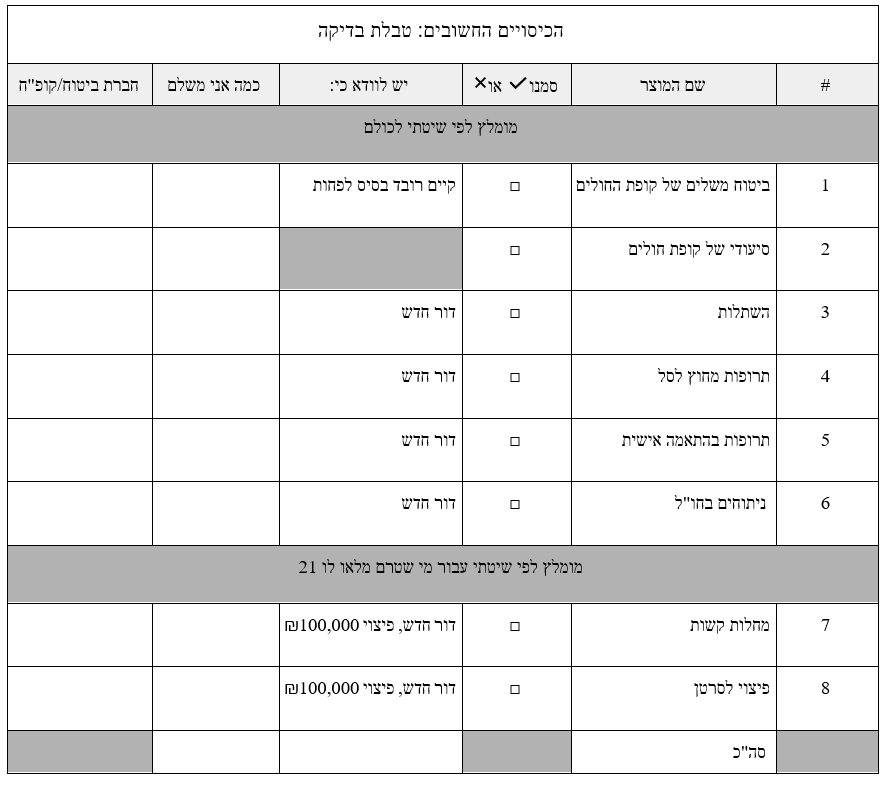 כדי להקל על תהליך הבדיקה, הכנתי עבורכם טבלה למילוי פרטי הכיסויים שלכם. הדפיסו ומלאו אותה כדי לוודא שאתם מוגנים!