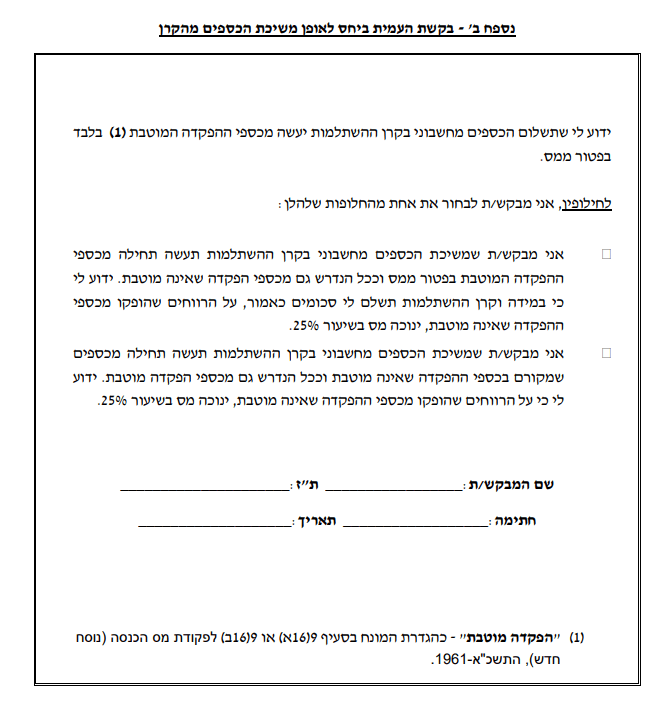 חשוב לשים לב כי לצורך משיכת הכספים החייבים בלבד, יש לסמן את האפשרות השנייה המופיעה בטופס, משיכת הכספים שמקורם בהפקדה שאינה מוטבת.