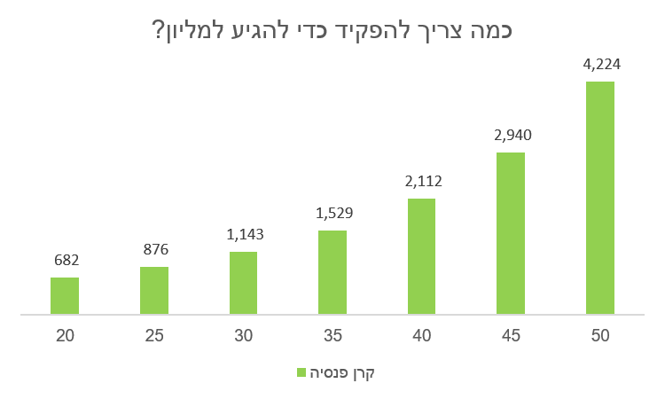 חיסכון של מליון ש"ח הוא לא חלום רחוק, במידה ואתם בני 20 הפקדה חודשית של 502 ש"ח תביא אתכם למליון. אבל במידה ואתם מבוגרים רק בעשר שנים תידרשו להפקיד כבר כמעט סכום כפול