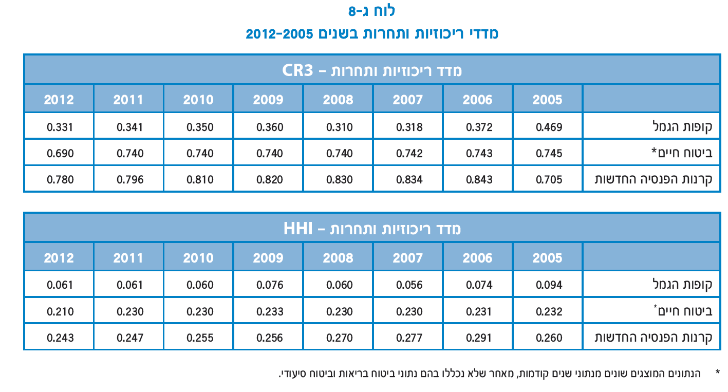בדוח הממונה על שוק ההון לשנת 2012 שהתפרסם השבוע מופיע כי הריכוזיות בתחום קרנות הפנסיה הולכת וקטנה החל משנת 2006.