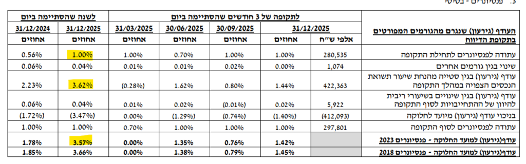 לדוגמה (שוב) מתוך המאזן האקטוארי של מנורה מבטחים, את שנת 2025 החלו הפנסיונרים עם עודף אקטוארי צבור של 1% שנובע מההעליות שהיו בשנת 2024. בשנת 2025 השיגה הקרן תשואה עודפת של 3.62% שאפשרו לה לשמור עודף של 1% שישמשו אותה בשנת 2026.