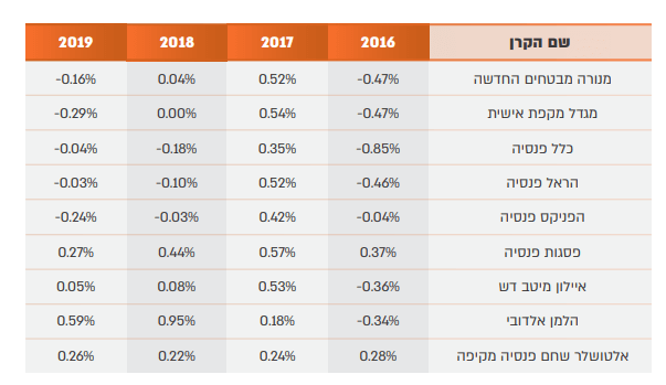 שמשווים בין קרנות הפנסיה במסלול השקעה ברמת סיכון דומה, רואים כי קיים פער משמעותי בתשואה שהשיגו הקרנות. בראש הטבלה נמצאים בתי ההשקעות מיטב דש ואלטשולר שחם ובתחתית הטבלה נמצאים בתי ההשקעות הלמן אלדובי ופסגות.