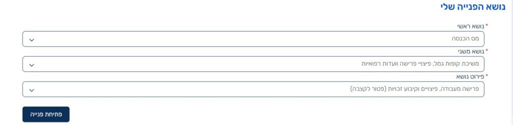 לאחר הרישום לאזור האישי, יש ללחוץ על לשונית פניות ולפתוח פניה באופן הבא: