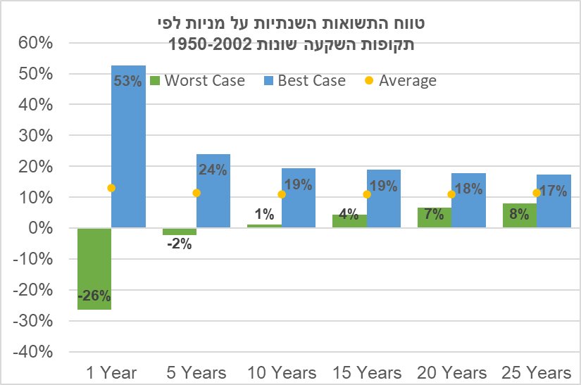 יתרה מכך, בהשקעה ארוכת טווח, כמו החיסכון הפנסיוני, תנודתיות מדדי המניות הופכת לחסרת משמעות. הנתונים ההיסטוריים מראים כי בהשקעה במדד מניות בפיזור רחב, ככל שההשקעה ארוכה יותר, כך הפרש התשואה בין פרק הזמן הטוב ביותר לפרק הזמן הגרוע ביותר הולך וקטן, וישנה התכנסות לממוצע התשואה הרב-שנתי (כ-10% נומינלית או 7% ריאלית).