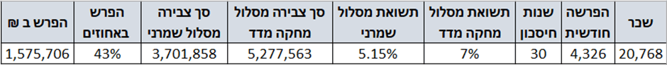 | שכר | הפרשה חודשית (100%) | הבטחת תשואה (30%) | שנים | צבירה במסלול מחקה מדד | צבירה במסלול תשואה מובטחת | הפרש צבירה |