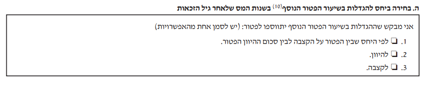 סעיף ה בטופס 161ד הוא סעיף נוסף בעל חשיבות גדולה ומחייב התייעצות עם בעל מקצוע, הסעיף קובע כיצד לנצל בעתיד את הגדלת הפטור ממס. הפטור ממס יגדל ב- 10% בשנים הבאות עליכם לבחור כבר היום האם לנצל את ההגדלה לצורך הגדלת הפטור ממס על הקצבה המזכה, או לצורך הגדלת הפטור על ההיוון או שילוב של השניים.