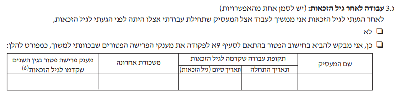 בסעיף זה עליכם לציין מענקים עתידים (כספי פיצויים) שאתם מעוניינים למשוך. למרות שהמשיכה תהייה בעתיד, כבר היום רשות המיסים תכפיל את הסכום במקדם 1.35 ותקטין את הזכאות לפטור על קצבה מזכה.