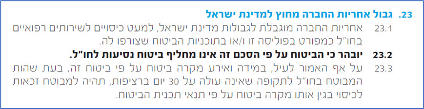 ביטוח בריאות פרטי אותו עשיתם בישראל לא תקף בחו"ל ולא יחליף ביטוח נסיעות לחו"ל. למען האמת סייג מסוג זה מופיע בפוליסות.